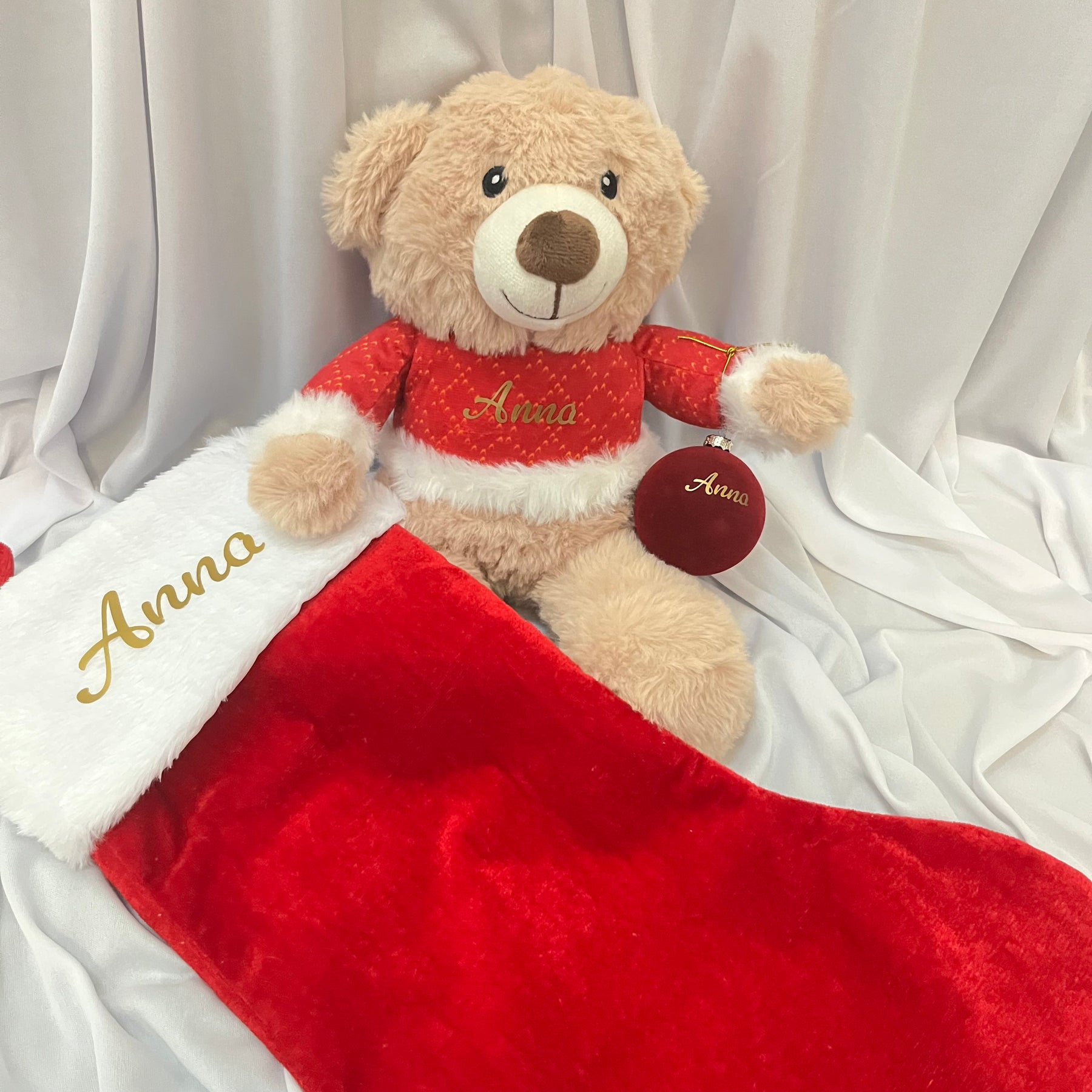 Ce trio unique comprend : un doudou tout doux, une boule de Noël rouge et une chaussette de Noël rouge de 45 cm, chacun personnalisé en doré avec le prénom de votre choix.
