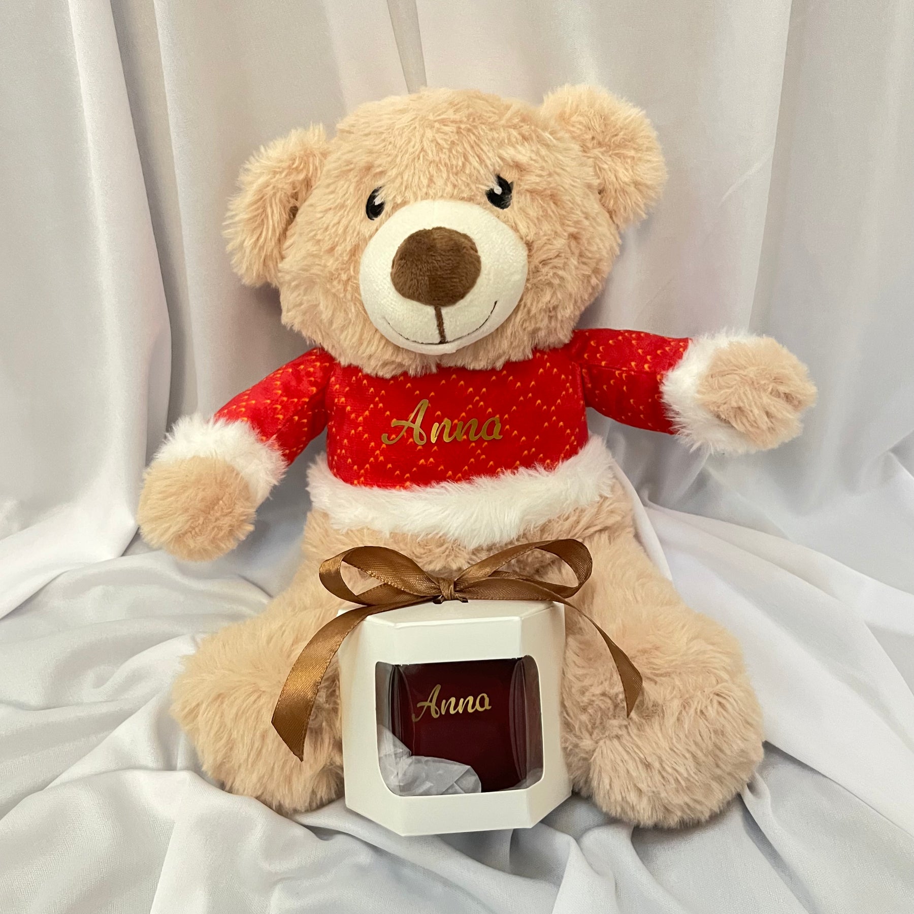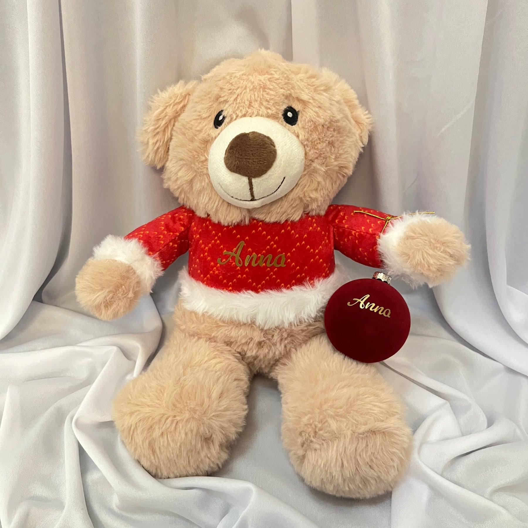 Le doudou tout doux accompagné d’une boule rouge avec le prénom de votre choix crée un ensemble tendre et festif, parfait pour Noël.