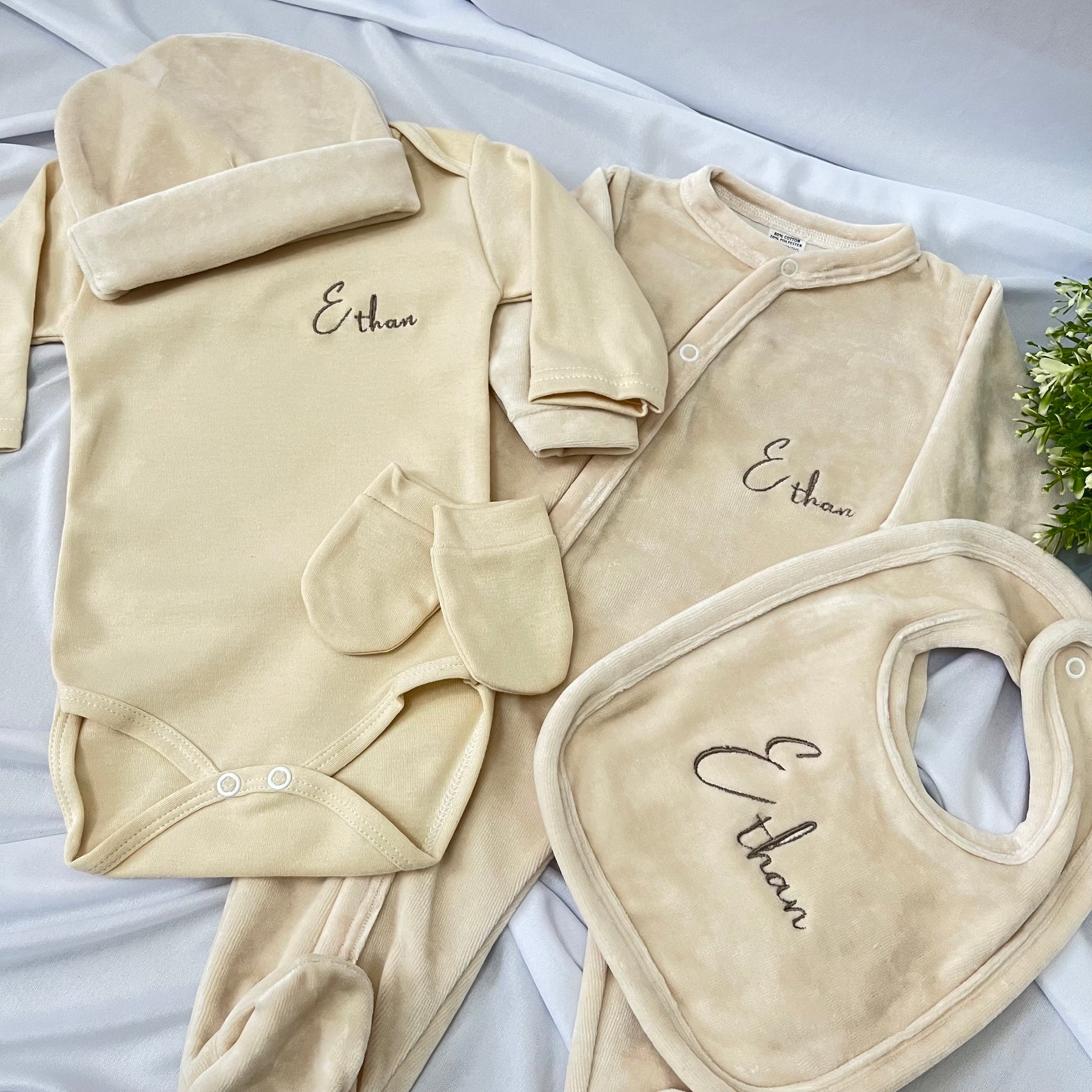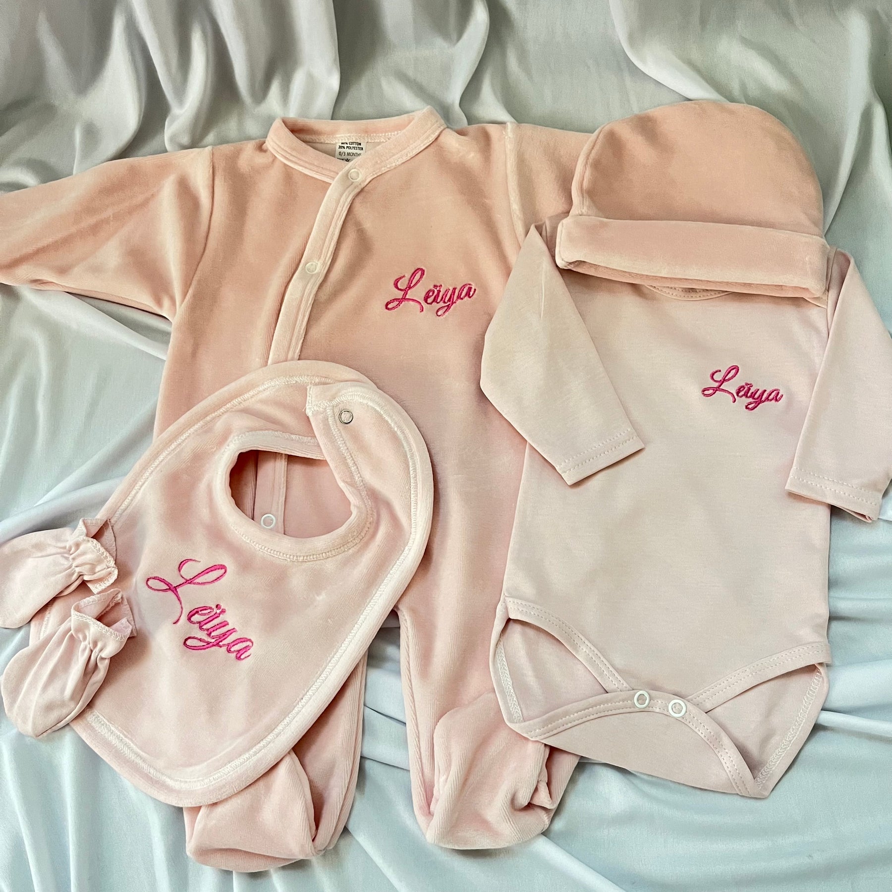 Offrez à bébé confort et douceur avec notre ensemble 5 pièces en velours personnalisé.