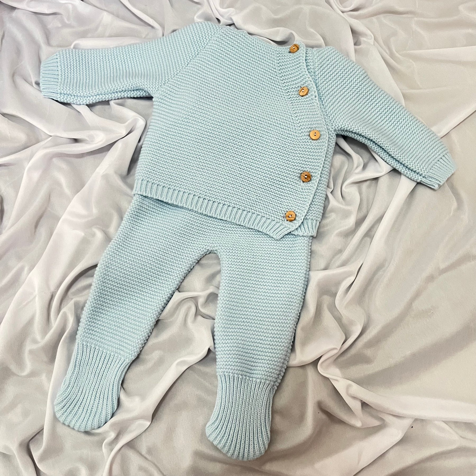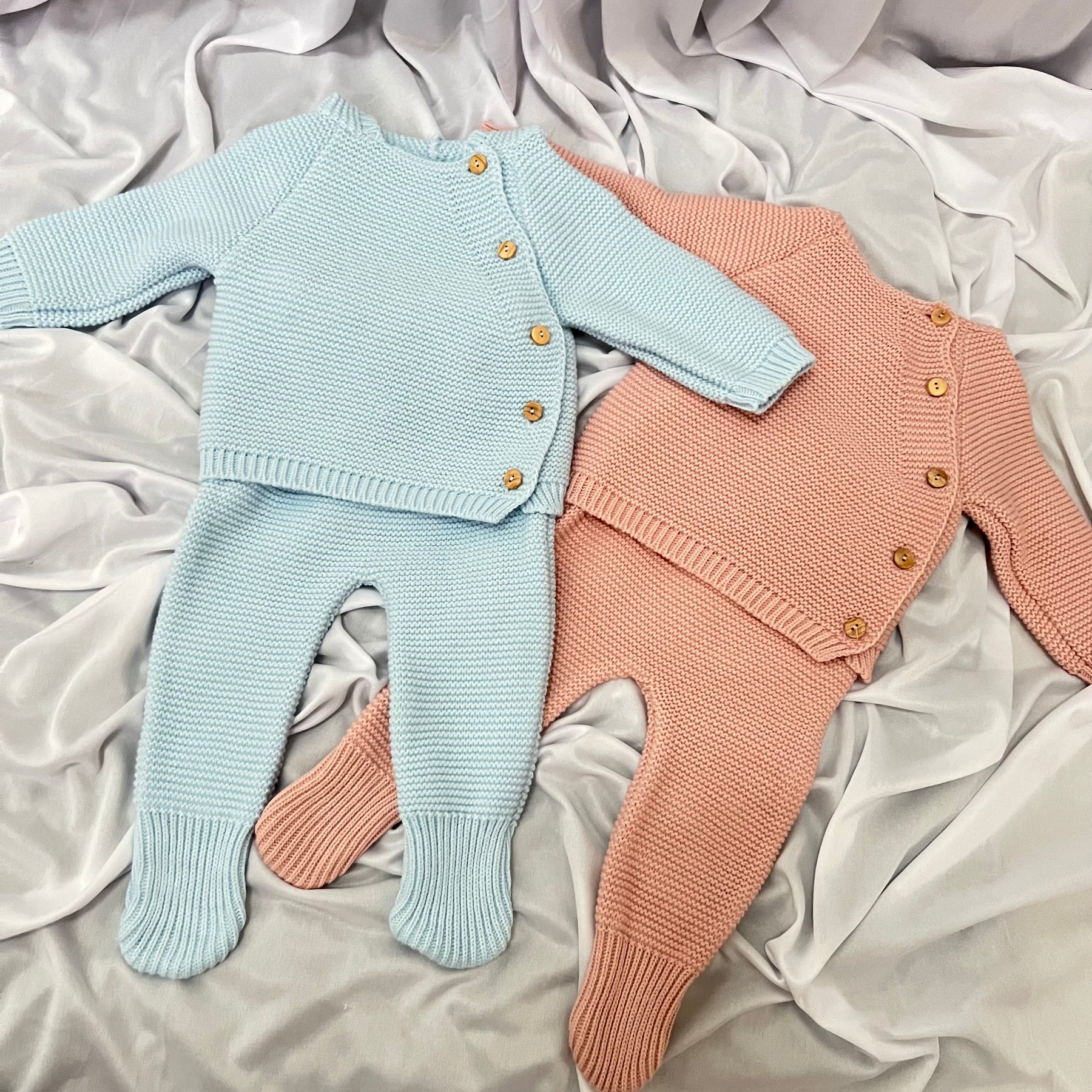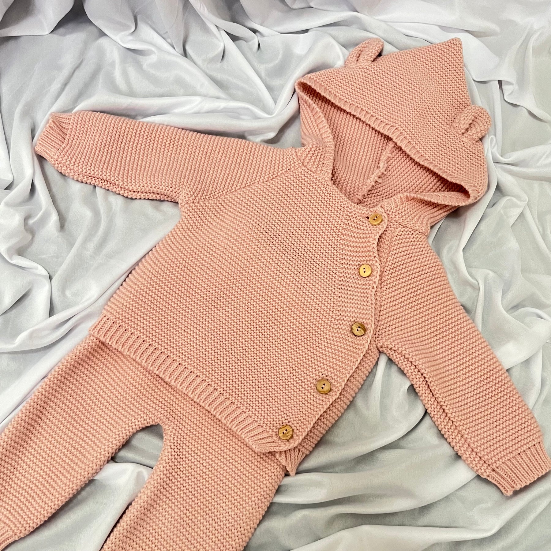 Offrez à votre bébé un cocon de douceur avec cet ensemble en maille, composé d’un pull à capuche avec petites oreilles et d’un pantalon assorti.