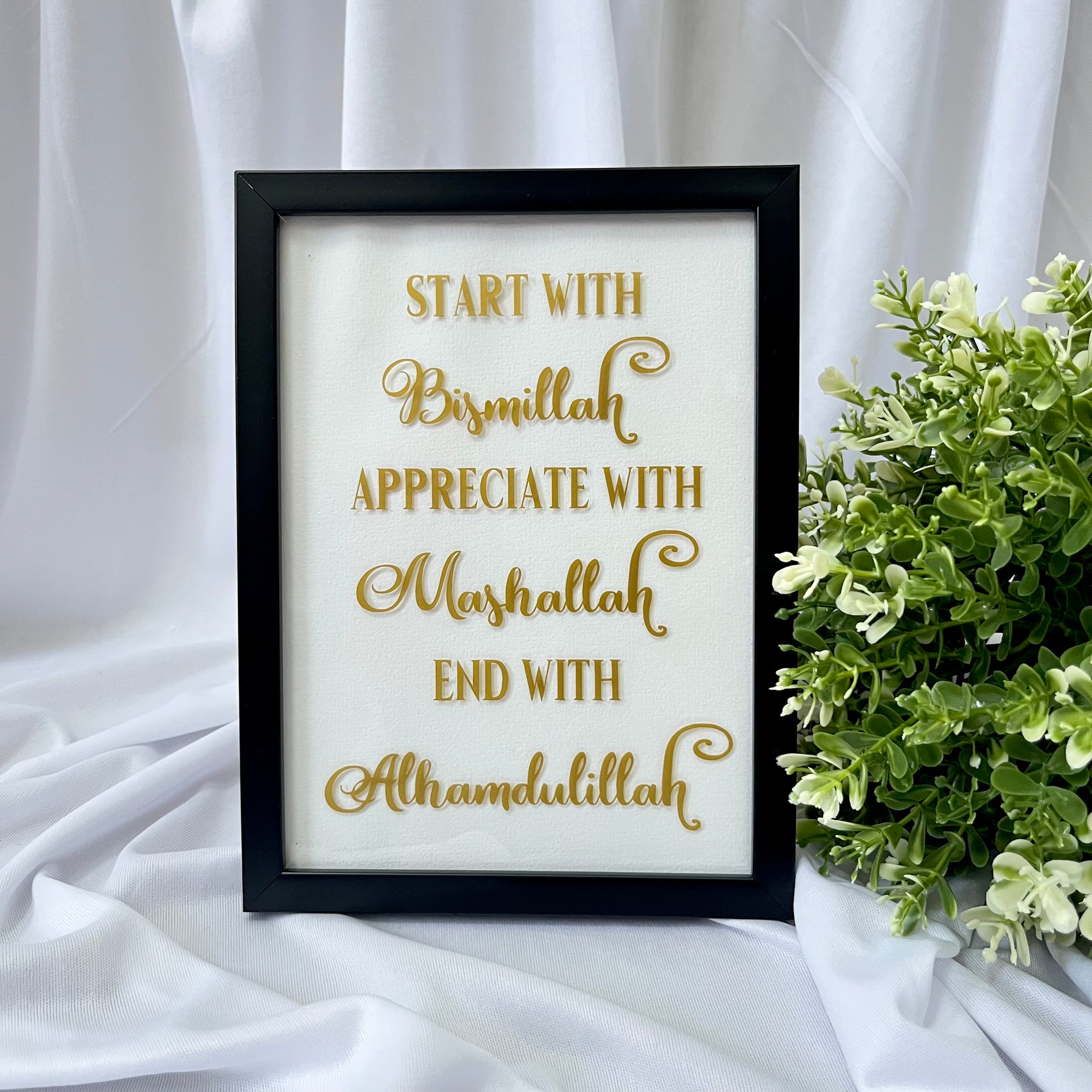 Chaque mot rappelle un principe simple mais puissant : commencer vos actions avec gratitude (Bismillah), célébrer les bénédictions autour de vous (Mashallah), et terminer chaque journée avec reconnaissance (Alhamdulillah).